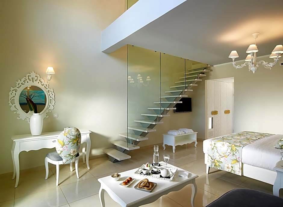 Anemos Luxury Grand Resort maisonettes consist of a set of rooms, typically on 2 stories, with common entrance, spacious bedroom with a king size bed, a small sofa and twin beds on the upper floor, a bathroom with bathtub and veranda.